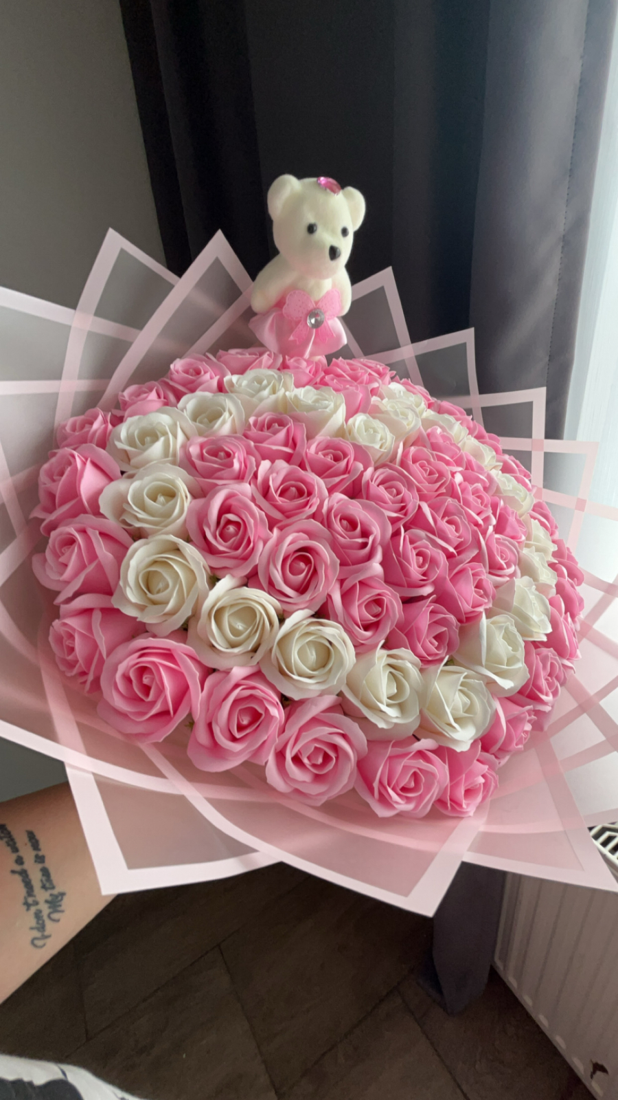 Buchetul de trandafiri din săpun este o alegere elegantă și rafinată, ideală pentru a aduce un strop de frumusețe și romantism în orice ocazie specială. Fiecare trandafir are un diametru de aproximativ 5 cm, cu petale fine care imită perfect textura naturală a florilor. Cu un aspect autentic și plin de farmec, acești trandafiri din săpun nu se ofilesc și își păstrează frumusețea timp îndelungat.