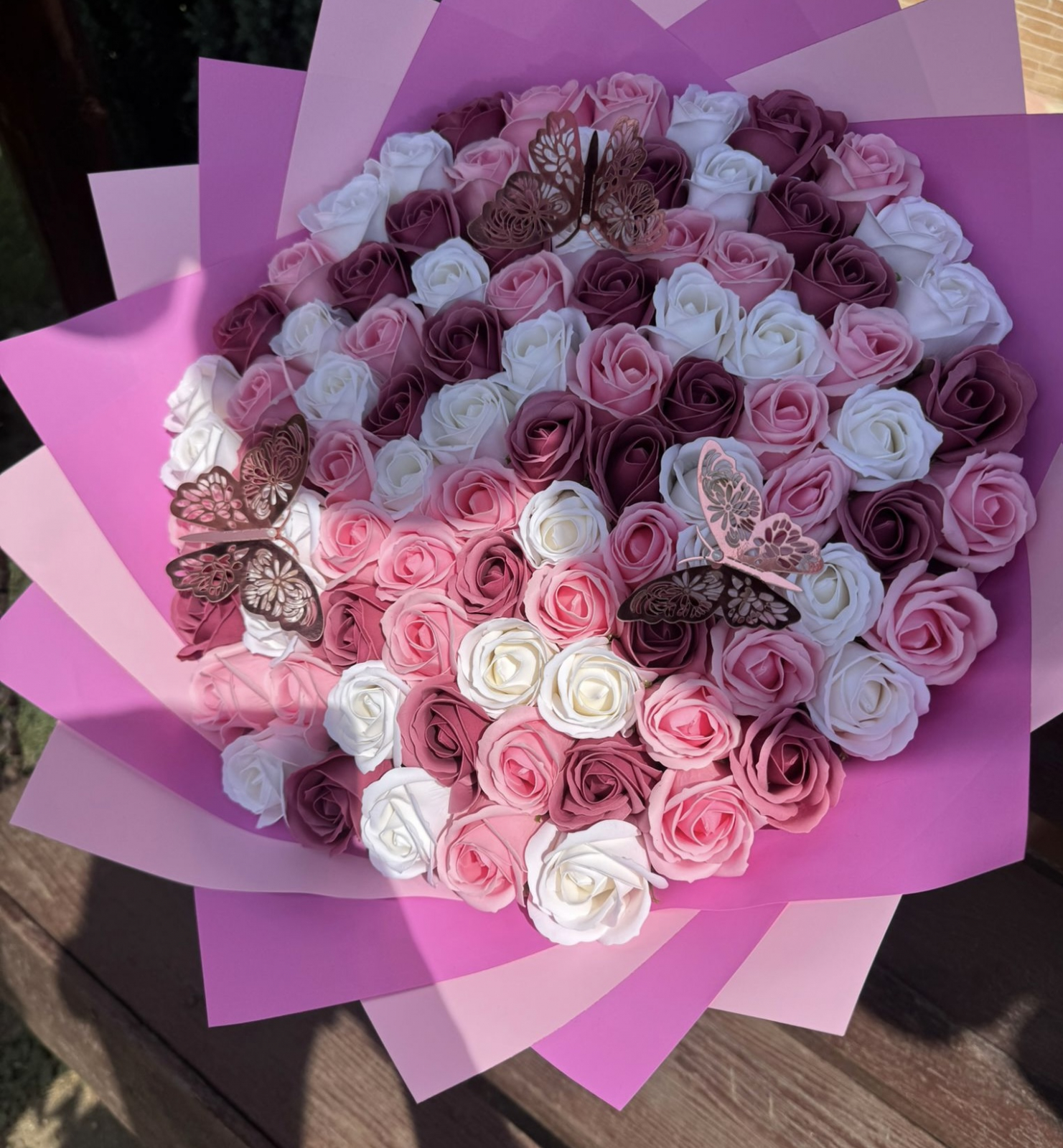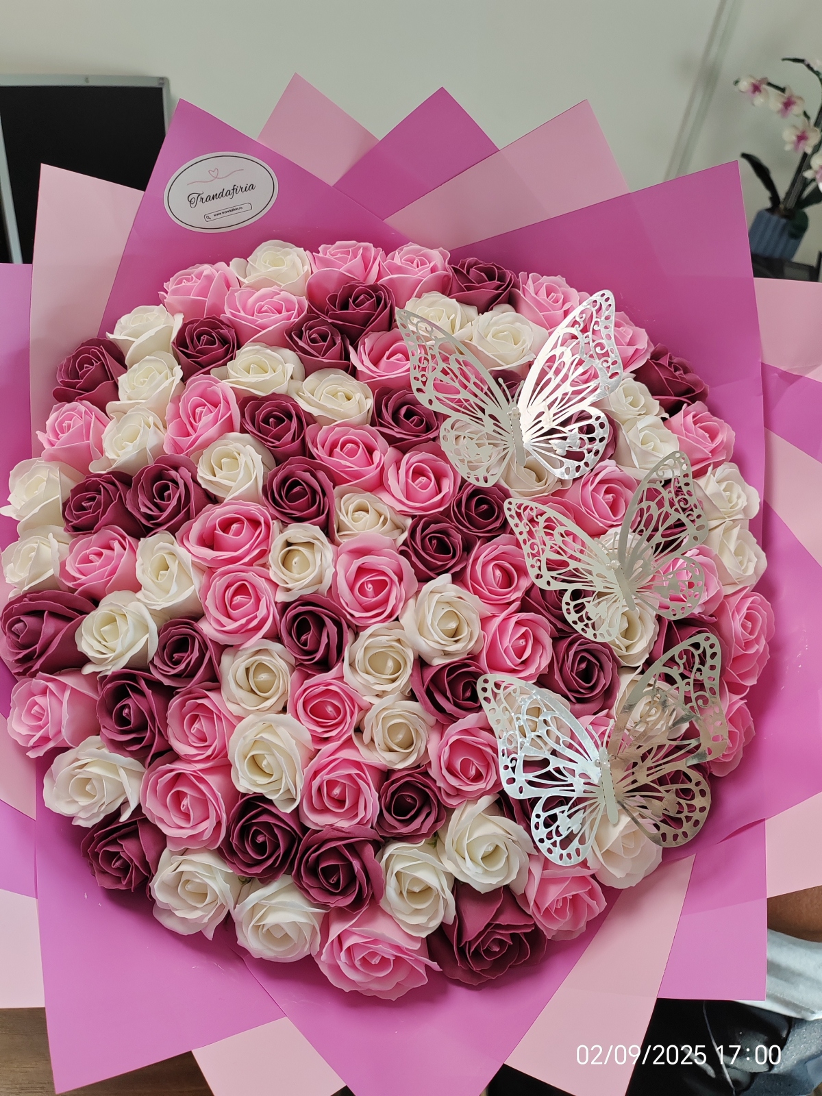 Buchetul de trandafiri din săpun este o alegere elegantă și rafinată, ideală pentru a aduce un strop de frumusețe și romantism în orice ocazie specială. Fiecare trandafir are un diametru de aproximativ 5 cm, cu petale fine care imită perfect textura naturală a florilor. Cu un aspect autentic și plin de farmec, acești trandafiri din săpun nu se ofilesc și își păstrează frumusețea timp îndelungat.